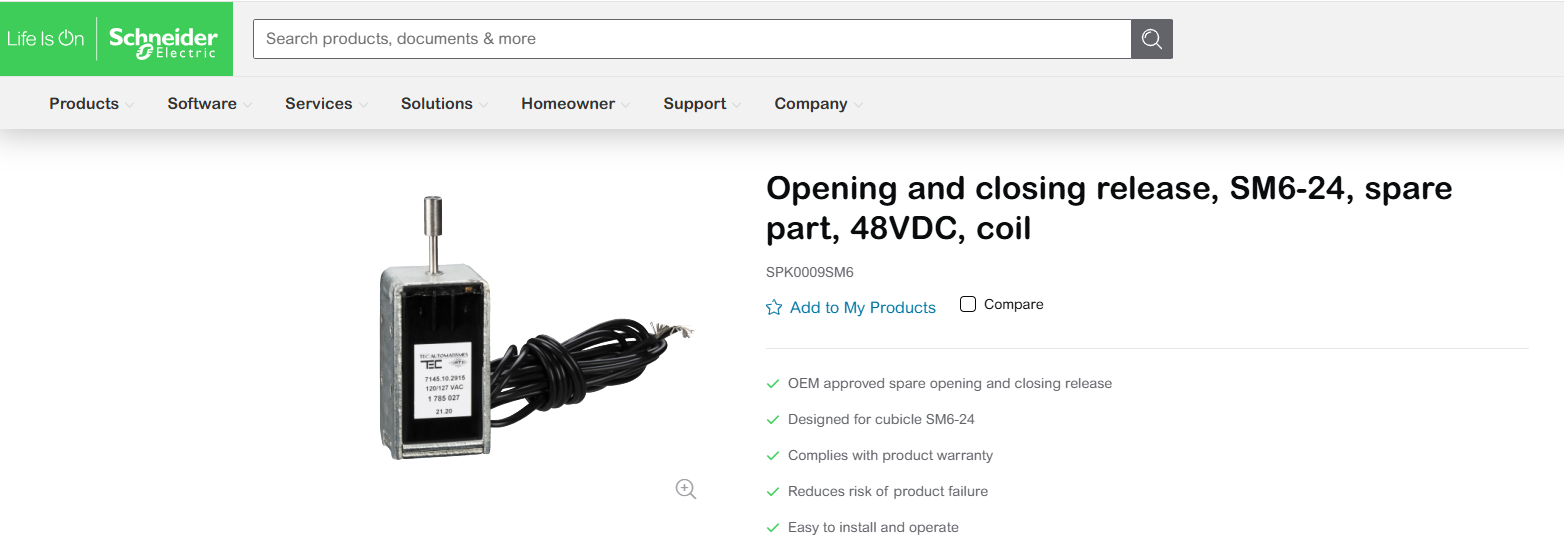 657; Schneider Electric Medium Voltage Switchgear Spare Parts Coil:
